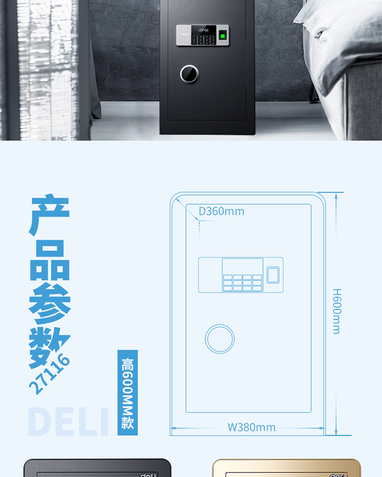 保险柜 高60cm指纹+密码双重防盗保管箱 办公家用保管柜保密柜 铂雅曜岩黑27116