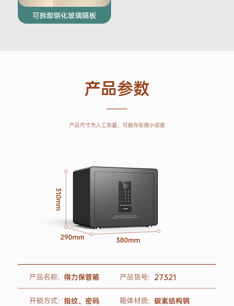 得力(deli)保险柜 高45cm半导体指纹+密码双重防盗自动开门保险箱保管箱 办公居家精品保险箱保管箱致雅27322