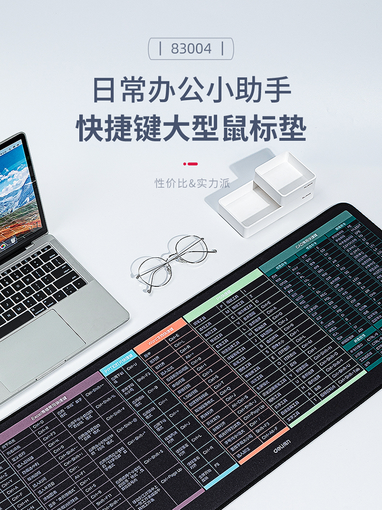 得力(deli) 快捷键鼠标垫 800*300*3mm 快捷键大全大号鼠标垫 锁边加厚办公电脑键盘桌垫 83004