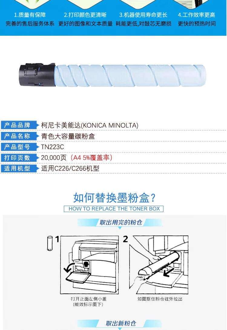 柯尼卡美能达 KONICA MINOLTA TN223C 柯美碳粉盒青色高容墨粉 (适用C226/C266) 印量20000页