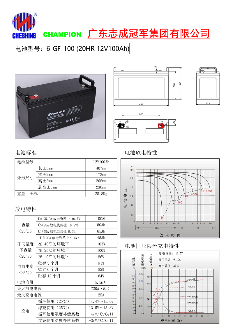 冠军(ineat)6-GF-100 12V 100AH 蓄电池