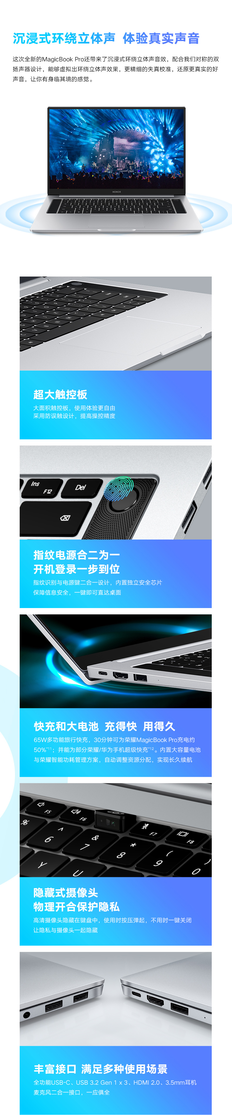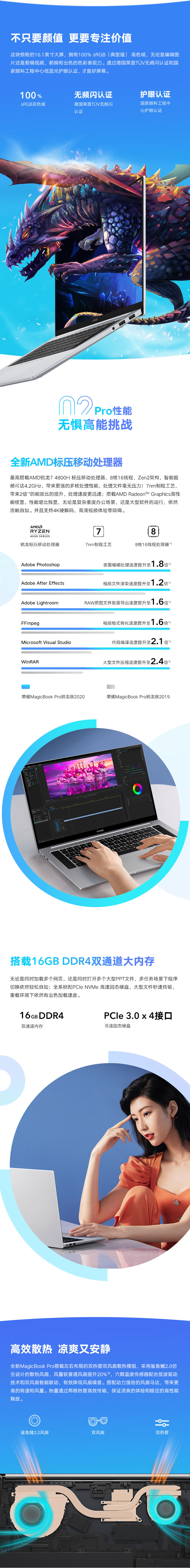 荣耀MagicBook Pro 2020款 16.1英寸全面屏轻薄笔记本电脑(R7 4800H 16G 512G 7nm 100%sRGB)冰河银