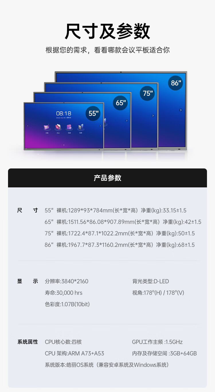 皓丽 E65企业版65英寸 会议平板一体机 教学办公会议平板触摸4K投影智慧大屏 安卓系统套装(含OPS电脑、同屏器、智能笔、移动底座)包安装