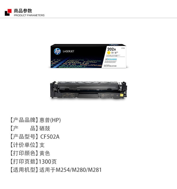 惠普 CF502A 202A 硒鼓 黄色 适用hp m281fdw/254dw/254NW/280NW/281FDN 单位:个