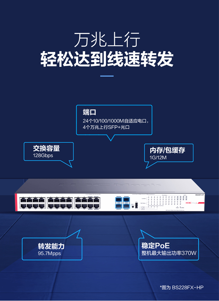 华三(H3C)24千兆电+4个万兆上行光纤口非网管企业级网络云管理POE交换机 370W供电网线分流器 BS228FX-HP