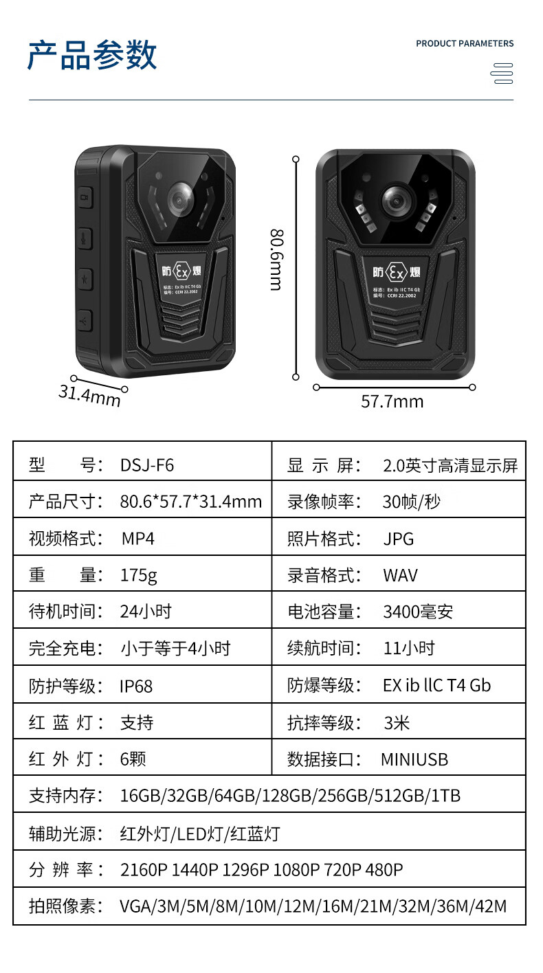 执法1号(zhifayihao)DSJ-F6 专业4K高清 防爆执法记录仪 石油化工煤矿用 GPS+WIFI版 64G