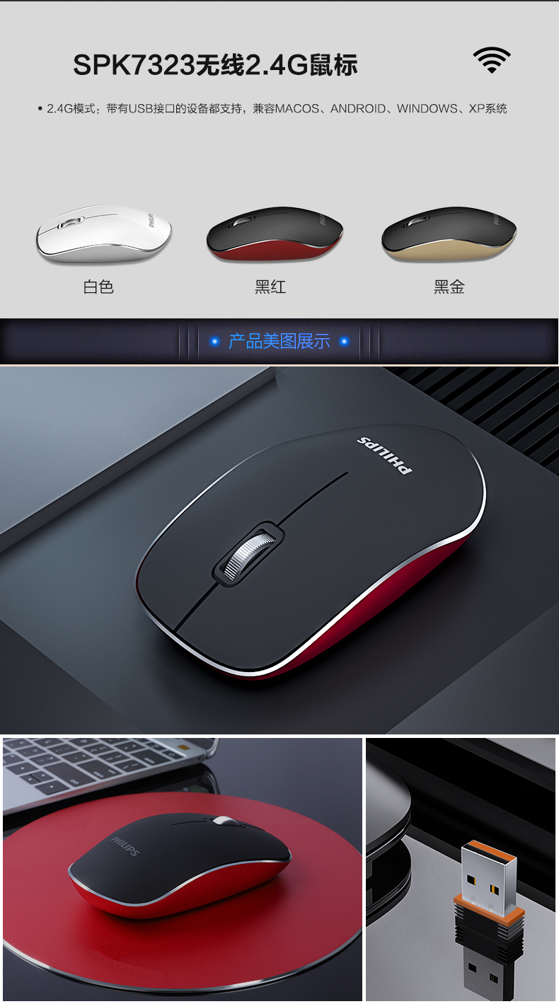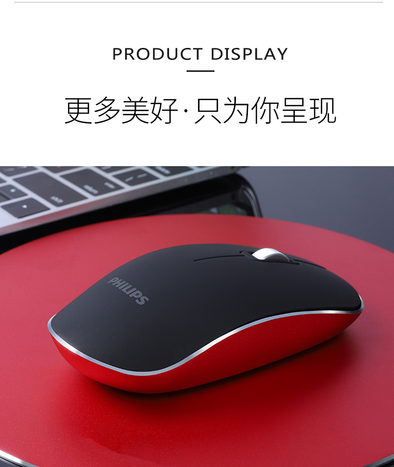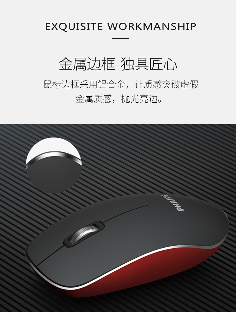 飞利浦 PHILIPS SPK7323 鼠标 无线鼠标 办公鼠标 低音鼠标 电脑鼠标 黑红 金属边框