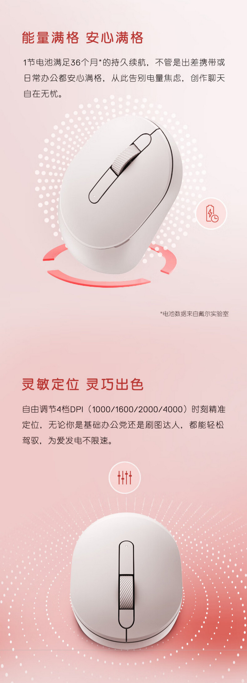 戴尔(DELL)蓝牙鼠标 无线双模 办公笔记本电脑台式机专用商务原装鼠标 USB外设 MS3320W 粉色