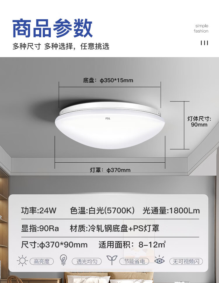 FSL佛山照明JY系列吸顶灯led卧室灯具书房阳台灯简易圆形24W白光D