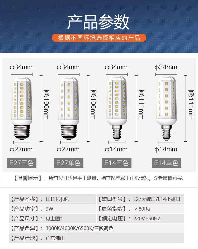 FSL佛山照明led灯泡E14小螺口玉米灯泡蜡烛泡家用水晶灯泡9W三段调色